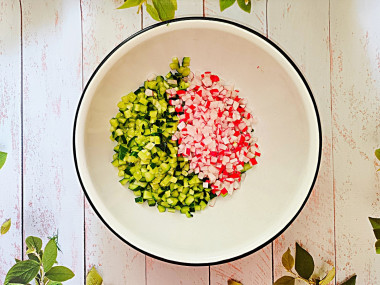 Огурцы и редиску помойте, обсушите, отрежьте у них хвостики. Нарежьте овощи небольшими кусочками. Как вариант, можете натереть их на крупной терке.