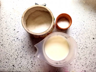 Возьмите глубокую миску или кастрюльку, влейте кефир. Добавьте к кефиру сахар и соль, хорошо размешайте, чтобы они растворились.