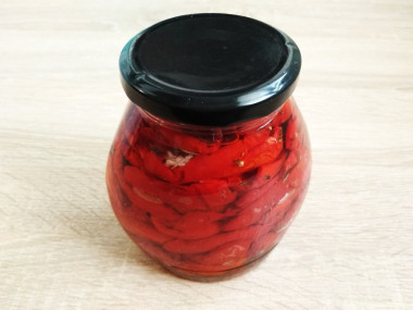 В стерильные банки слой за слоем перекладываем вяленые томаты чесноком и сушеными травами, если нужно добавляем соль.