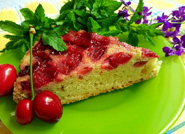 Выложите тесто в форму поверх черешни, чтобы черешня была полностью закрыта. Выпекайте пирог в разогретой до 180°С духовке около 30 минут. Точное время и температуру запекания определяйте по своей духовке. Готовый пирог переверните на блюдо, чтобы ягоды оказались сверху.