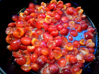 Тушите ягоды, помешивая, около 5 минут до частичного выпаривания жидкости и масла. Имейте в виду, что ягоды не должны свободно плавать в жидкости - масса должна получиться в меру густой. При этом слишком долго держать черешню на огне не стоит: она должна сохранить свою форму.