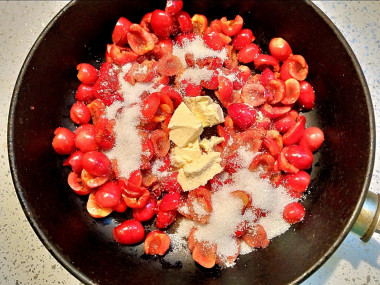 Растопите на сковороде сливочное масло. Советую не добавлять сразу все масло, лучше положите половину, а после, если будет нужно, добавьте еще. Выложите в сковороду подготовленную черешню, добавьте ванильный сахар.