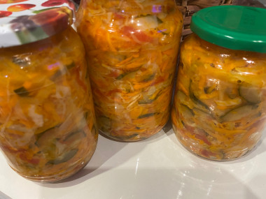 Добрый день. Делаю салат второй раз. Первый не дожил и до осени, съели с огромным удовольствием. Съели даже те, кто маринованные заготовки не любит. Очень понравился. Легкий в приготовлении. Хорош как самостоятельное блюдо, так и гарнир к различным мясным блюдам, да и просто с рисом, макаронами, картошкой. Буду делать ещё. И всем советую