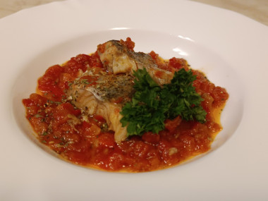 Подаем на стол минтай в томатном соусе самостоятельно или с гарниром из картофеля. По желанию рыбу можно украсить свежими листиками тимьяна.