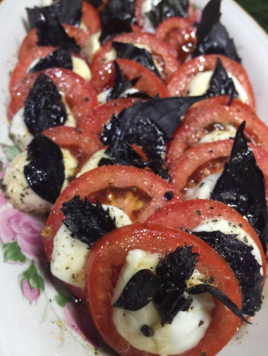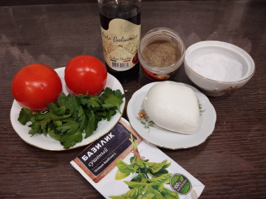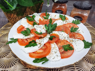Помидоры и моцареллу порезала тонкими ломтиками,выложила на тарелку,чередуя между собой. Слегка посолила, добавила базилик, петрушку и сверху немного полила бальзамическим уксусом!