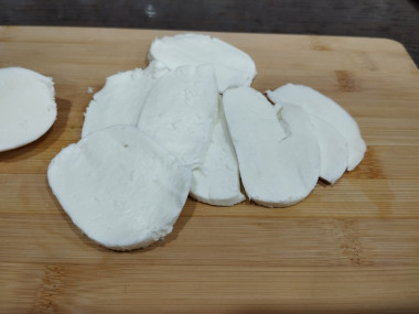 Шарик моцареллы выньте из рассола, обсушите и нарежьте тонкими ломтиками. Чем тоньше нарежете, тем вкуснее получится салат. Вообще тонкая нарезка для этого салата очень много значит.
