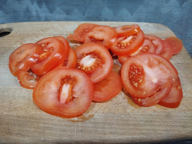Помидоры вымойте, обсушите и нарежьте тонкими кружочками.