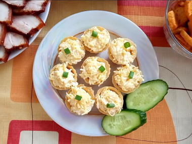 Приготовила тарталетки с яйцом по этому рецепту. Покупала песочные тарталетки небольшого размера. Сыр выбрала плавленый по совету автора. Яйца отварила и остудила чуть заранее. Натирала все ингредиенты на средней тёрке и смешивала с майонезом. Начинку попробовала, получилась очень вкусная) Заполнила мини тарталетки сырно-яичной массой. В каждую тарталетку у меня поместилось по 2 чайных ложки начинки. Украсить я не успела даже, закуска разлетелась на ура. Остренькая и нежная начинка всем понравилась, а в сочетании с хрустящей тарталеткой вышло даже очень сытно. Тарталетки с сыром и яйцом очень красивая, вкусная и быстрая закуска на любой стол. Буду ещё готовить и всем советую! Благодарю автора за идею!