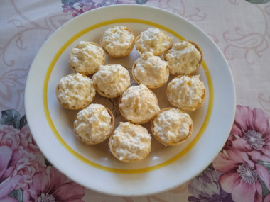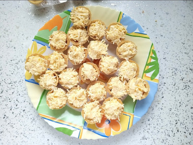 Начинку просто разложила чайной ложечкой по тарталеткам. Закуска разошлась первой! Всем очень понравились вкусные "корзиночки"!