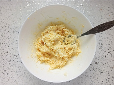 Натрите на средней терке сыр. И переложите его сразу в салатник, в котором позже будете смешивать массу.