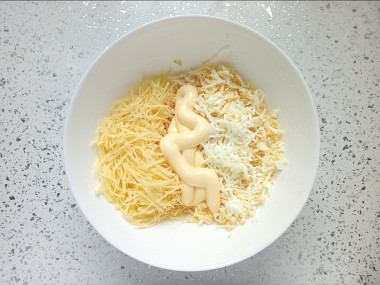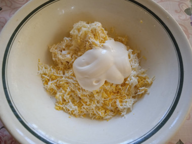 В салатнике соедините тертые яйца, сыр и чеснок.