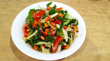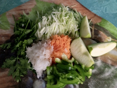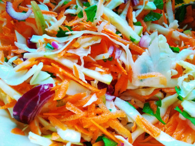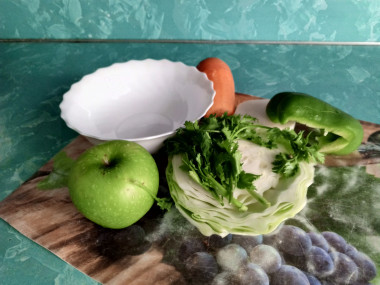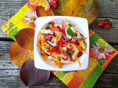 Недавно готовила подобный салатик, а тут нашла похожий, с дополнением. Осенью такой салат просто необходим для получения порции витаминов. Капусту я сразу присыпала сахаром и солью и помяла, сока выделилось много. Морковь натерла на крупной терке, а вот яблоко порезала соломкой. Люблю, когда яблоко хорошо чувствуется, оно придает дополнительную свежесть овощам. Лук у меня фиолетовый, он менее горький, чем обычный. К тому же такой лук красиво смотрится в салате. Перца взяла две штуки, они были не слишком крупные. Болгарский перец придает салату не только свежесть, но и сочность. Зелень у меня в виде ароматной петрушки. В конце заправила лимонным соком и растительным маслом. Салат получился ярким, красочным, сочными. Как раз для поднятия настроения в хмурую погоду. На вкус просто потрясающе! Такое разнообразие овощей со множеством вкусов и ароматов, кисло-сладкий вкус мне понравился. Салат прекрасно дополнил ужин, очень вкусно.