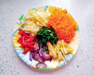 Так же нарежьте тонкими брусочками болгарский перец. Я добавила всего лишь половину перца. Но вы можете добавить и целый. В чашу к салату выложите нарезанный лук и болгарский перец.
