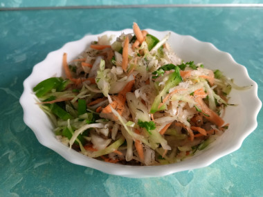Отличный салатик. Правда лук я заменила на лобу (дайкон был бы лучше, сочнее). Перед ужином самое то 👍.