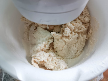 Влейте молоко с дрожжами в подготовленную заранее мучную смесь, перемешайте. Растопленное сливочное масло влейте в тесто. Вымешивайте тесто не менее 10 минут, чтобы насытить его кислородом. Тесто получится мягкое, но достаточно липнущее к рукам. Возможно муки понадобится чуть меньше или больше, ориентируйтесь на желаемую консистенцию теста.