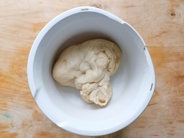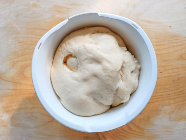 Подходило у меня тесто при комнатной температуре 3 часа. Подошедшее тесто отправила в холодильник ещё на 4 часа. Отстоявшееся тесто получилось мягким, податливым, абсолютно не липким. Даже рабочую поверхность при формировании булочек не пришлось присыпать мукой.