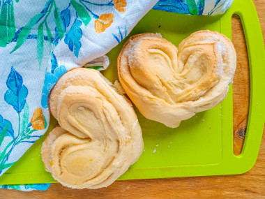 Из получившегося теста сделала булочки-сердечки с сахаром. Выпекала их при 180 градусах около 35 минут. Булочки получились пышные, воздушные, мягкие как пух.