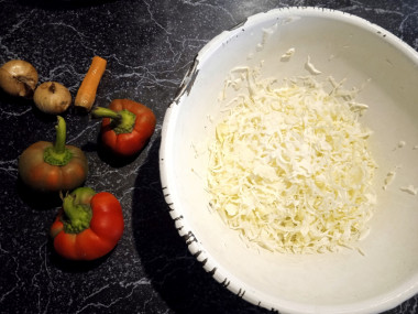 С кочана капусты снимите верхние листья, вырежьте кочерыжку. Нашинкуйте белокочанную капусту не очень мелко, как и все остальные овощи, иначе в процессе термической обработки они могут потерять форму и превратиться в овощное рагу.