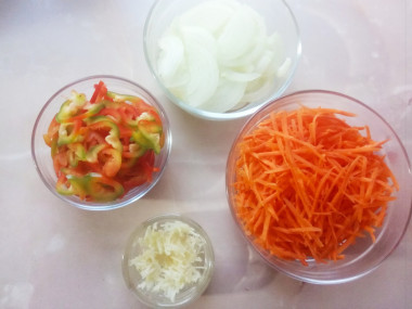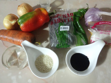 Калорийность продуктов: Морская капуста, Лук, Морковь, Болгарский перец, Чеснок, Перец чили, Уксус, Кунжут, Соевый соус, Глютамат натрия, Растительное масло