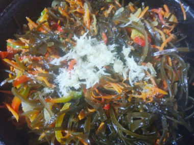 Сушеную капусту тщательным образом промойте и замочите в холодной воде до часу. После  варите до полной готовности (капуста должна стать мягкой). Времени на это может потребоваться более 20-ти минут. Натрите на крупной терке морковь (или нарежьте ее соломкой), нарежьте лук полукольцами. Раскалите в большой сковороде растительное масло, добавьте острый перец и жарьте быстро, перец уберите. После положите кунжут и тоже быстро жарьте, кунжут уберите. Теперь положите лук и, помешивая, тушите. Добавьте морковь. Оба овоща не должны изменить цвет на коричневый. Всыпьте нарезанный соломкой сладкий перчик и нарезанную морскую капусту. Помешивая, обжаривайте все на медленном огне. Снимите с плиты, выдавите чеснок, влейте уксус, добавьте глютамат натрия и, если хотите, соевый соус. Оставьте под полотенцем на час. Эта еда отлично сохраняет все свои вкусовые качества в холодильнике в течение недели.