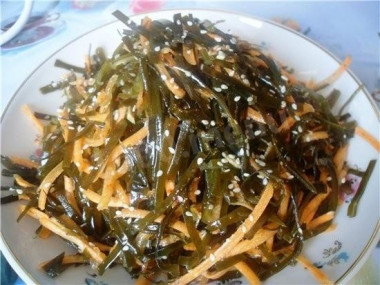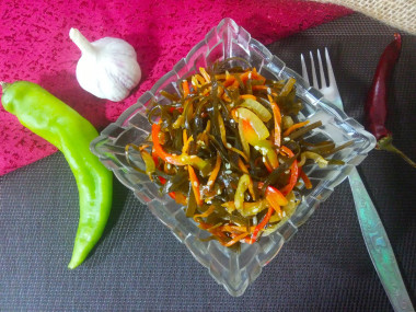 Сделала морскую капусту по корейски. Сухую капусту заливала холодной водой несколько раз, каждый раз очень хорошо ее промывала, отжимала и вновь оставляла на некоторое время в холодной воде. Это обязательное условие, чтобы избавиться от песочка и слизи, которая появляется при вымачивании ламинарии. Промытую капусту отваривала 20-30 минут. За это время нарезала и обжарила овощи. Салат очень вкусный, полезный, сочный, остренький и пикантный. Чем дольше обжаривать перец чили, тем острее будет салат- не переборщите! Спасибо автору за рецепт!
