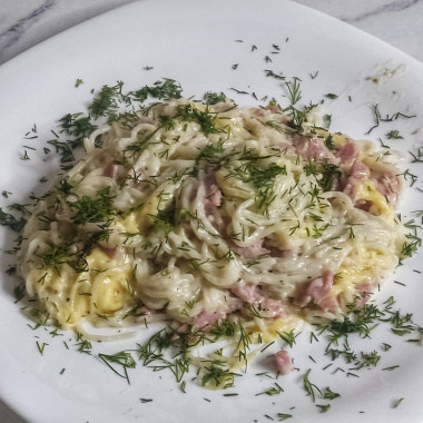 Добавила к ветчине спагетти, сливки,протушила немного и в конце посыпала тёртым сыром. В готовое блюдо добавила зелень укропа.