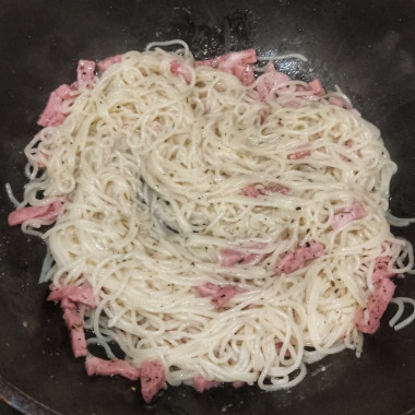 Выложите пасту в сковороду к ветчине и перемешайте.