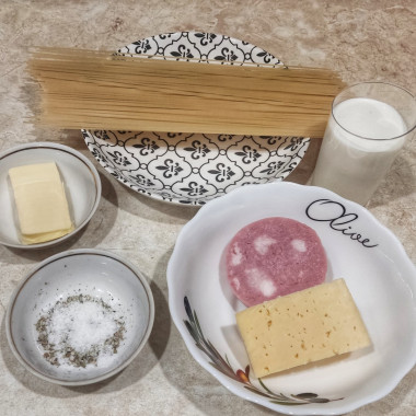 Как сделать макароны с ветчиной и сыром в сливочном соусе на сковороде? Подготовьте необходимые ингредиенты. Макароны можно взять любой формы, главное, чтобы они были из твердых сортов пшеницы — такая паста не разваривается, вкуснее и полезнее. Подробнее о тонкостях выбора макарон читайте в отдельной статье, ссылка в конце рецепта. Сливки можно использовать любой жирности. Помните, чем выше процент жирности сливок, тем более калорийным получится блюдо.