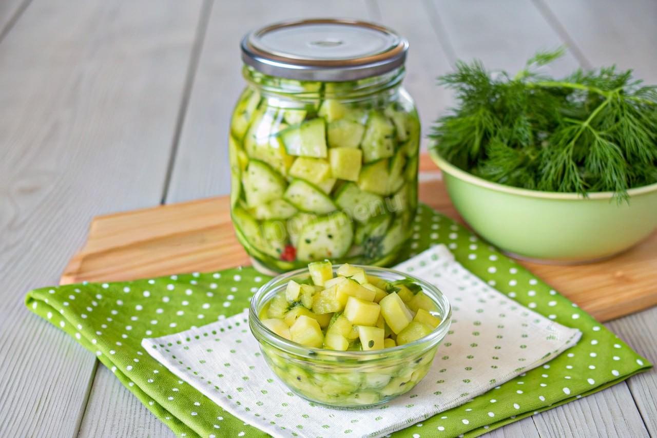 Если вы используете более зрелые плоды, с уже жесткой кожурой и мякотью с семенами внутри, тогда промойте их, почистите от кожуры и удалите сердцевину с семенами. Вес таких кабачков нужно рассчитывать в уже очищенном виде. Порежьте кабачки кубиками. Кладем кубики кабачков в глубокую емкость, лучше использовать стеклянную.