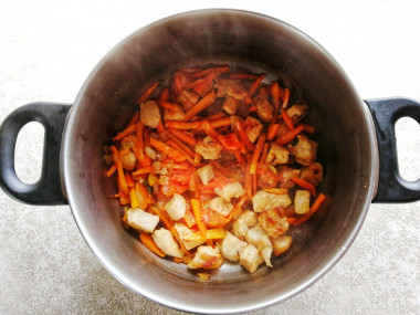 Постепенно добавляйте овощи к жарящемуся мясу, помешивая, чтобы не пригорало. И продолжайте тушить все около десяти минут.