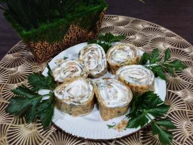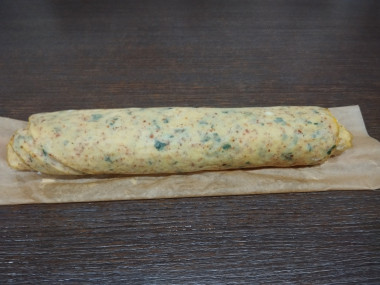 На остывший готовый корж выложила сырную начинку и аккуратно свернула рулетом. Завернула в фольгу и убрала в холодильник на ночь.