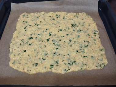 Противень застелите бумагой для выпечки. Смажьте ее маслом. Выложите на бумагу тесто, аккуратно разровняйте его лопаткой. Толщина слоя должна получиться не более 1 см. Поставьте противень с тестом выпекаться в духовку, предварительно нагретую до 180 градусов.