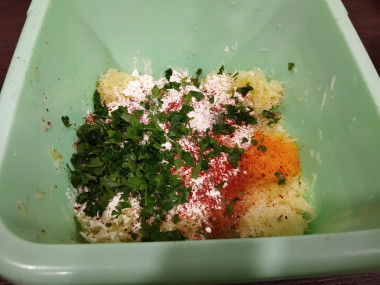 Зелень обмойте, хорошо обсушите и мелко нарежьте. Соедините кабачок, желтки, мелко нарезанную зелень и перемешайте.