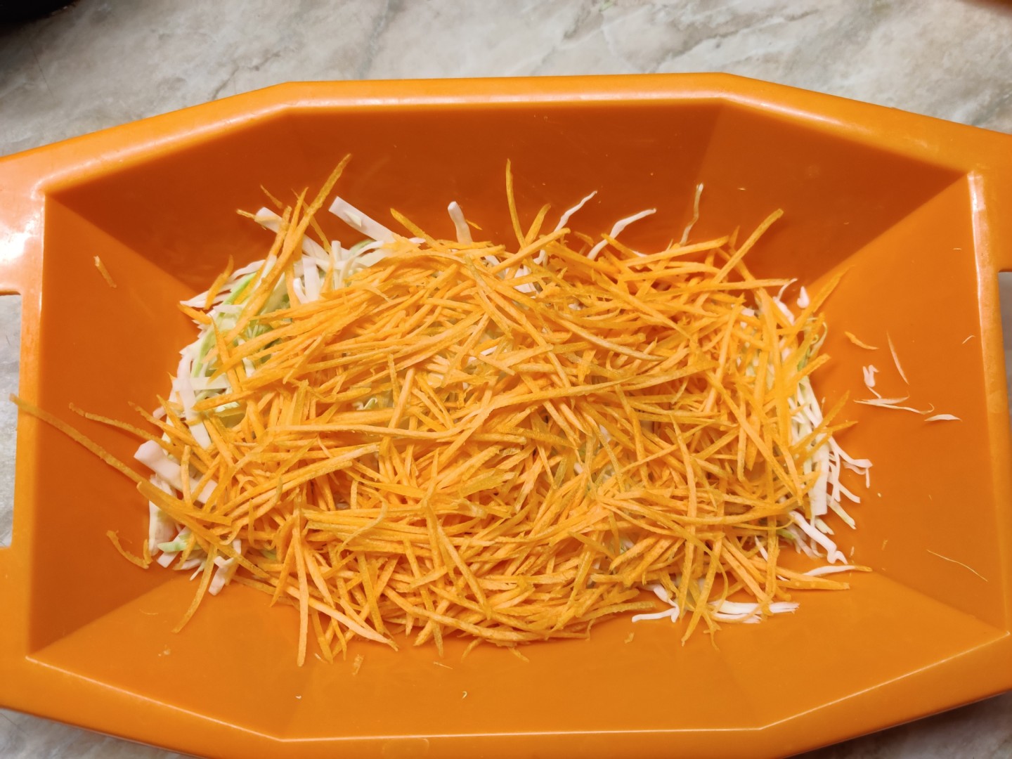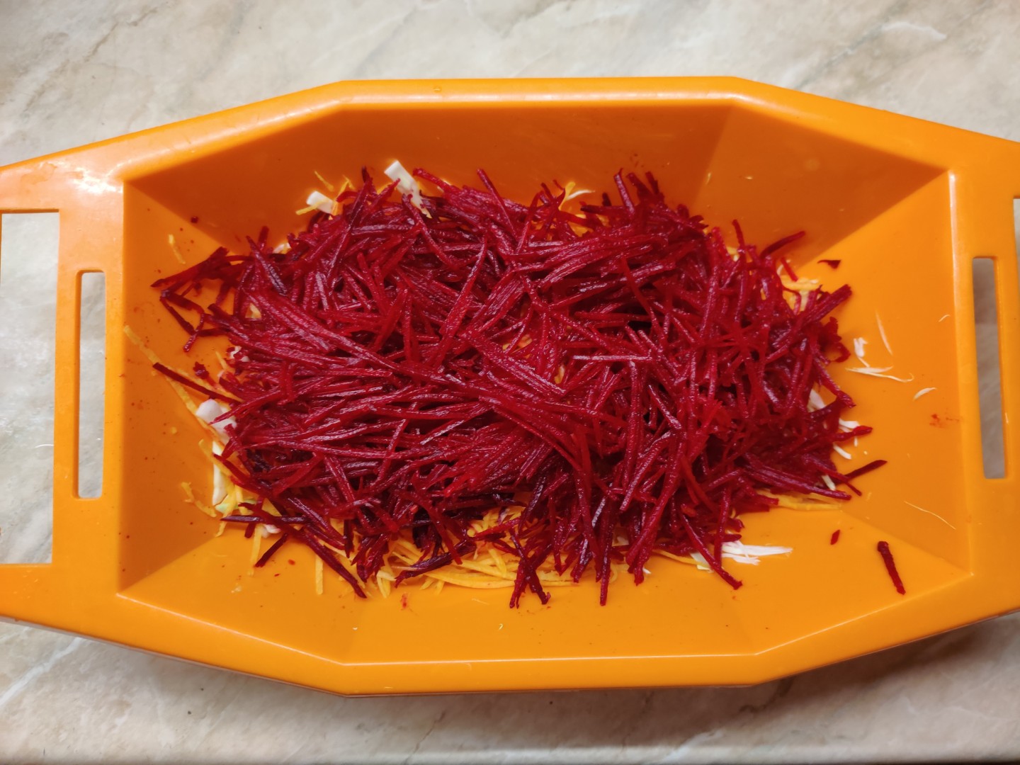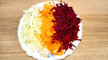 Белокочанную капусту нарежьте тонкой недлинной соломкой. Морковь и свеклу удобно натереть тонкой соломкой на терке для корейской моркови. Если такой нет, то нарежьте овощи ножом как можно тоньше. От этого будет зависеть вкус и вид салата. Положите овощи в салатник.