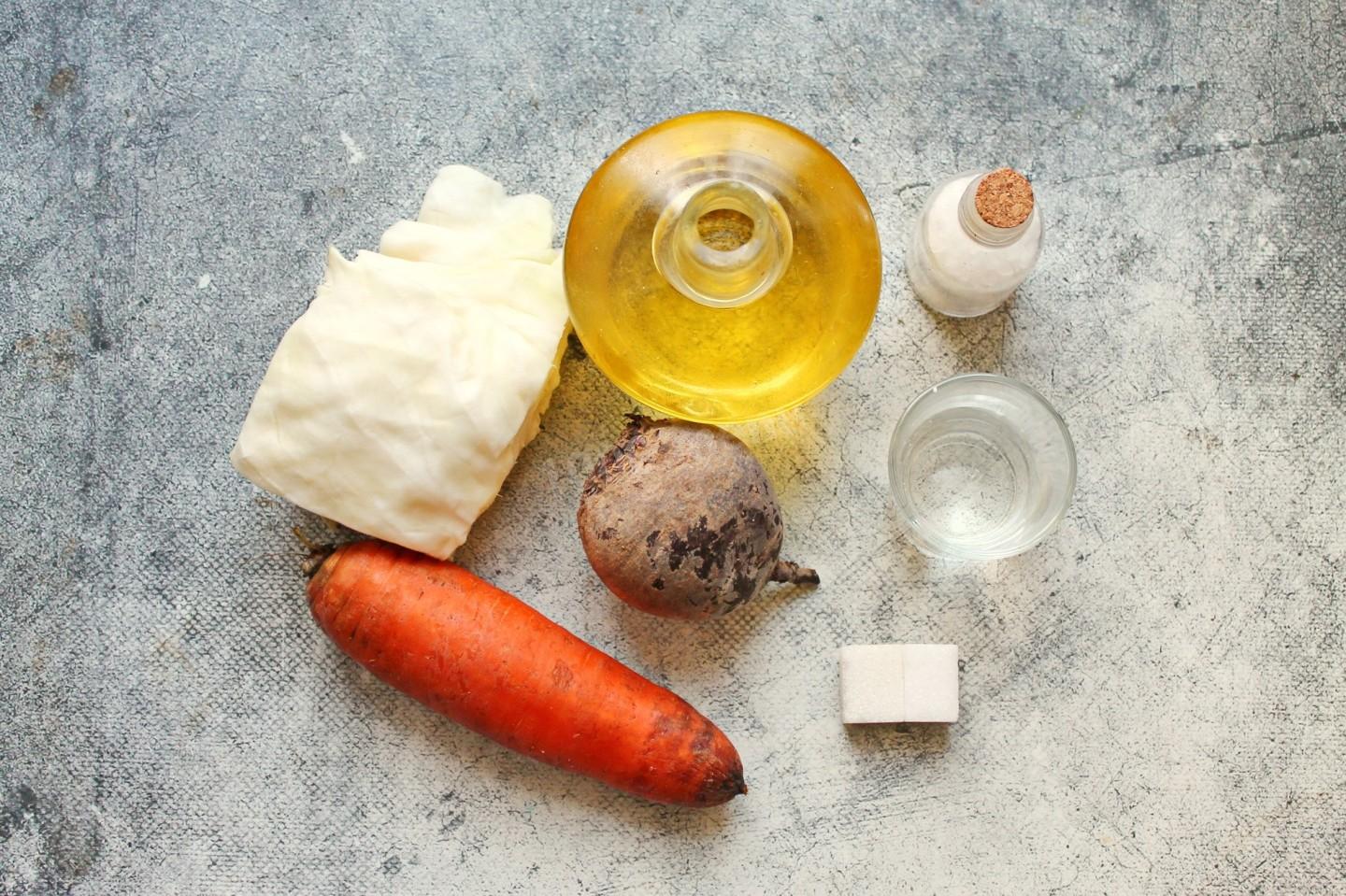 Подготовке все необходимые ингредиенты для приготовления. У капусты удалите верхние и загрязнённые листья, морковь и свеклу тщательно вымойте, почистить. Овощи сполосните и дайте воде полностью стечь.