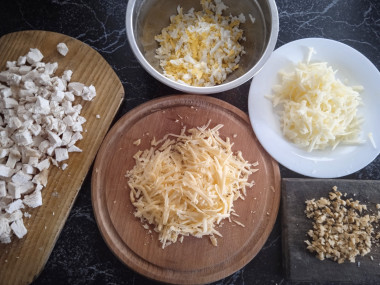 Грецкие орехи мелко порубите ножом. Куриную грудку мелко нарежьте.