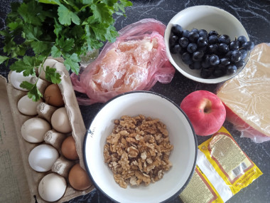 Как сделать Салат Виноградная гроздь? Ингредиенты. Куриную грудку и яйца предварительно отварите.