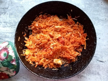 Добавьте томатную пасту и тушите вместе с мясом до мягкости овощей.