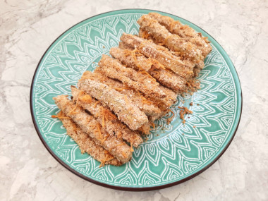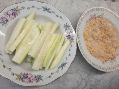 Каждый кусочек обмакивайте в панировке. Если она осыпается, тщательно прижмите - она будет держаться. Чем её больше на кабачке, тем вкуснее получается. Проделайте так со всеми кусочками.