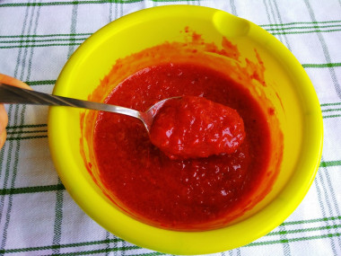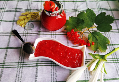 Перебирала морозилку и нашла пакет с прошлогодней калиной. Ну раз за зиму не съели, решила приготовить из нее сырое варенье. Калину вместе с сахаром измельчила в блендере. В течение дня перемешивала варенье, чтобы разошелся сахар. К вечеру калина с сахаром загустела и немного поменялся цвет. На вкус оно специфическое, конечно, немного с горчинкой. Но зато аромат такой насыщенный! Мне такое варенье нравится, оно необычное. А косточки нисколько не мешают, там более калина очень полезна, буду с ней чай пить.