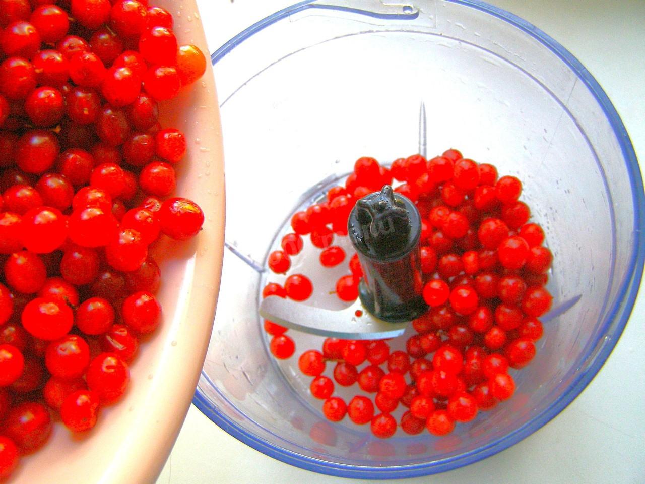 Ягоды красной калины всыпьте в чашу блендера. Скорее всего весь объем ягод сразу измельчить не удастся, поэтому делайте это частями.