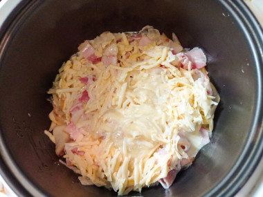 Уложите сверху оставшийся картофель, посолите его и посыпьте второй половиной сыра. Закройте крышку мультиварки и выставите программу, подходящую для запекания. У меня это "Выпечка", у вас может называться по-другому. Время установите 1 час.