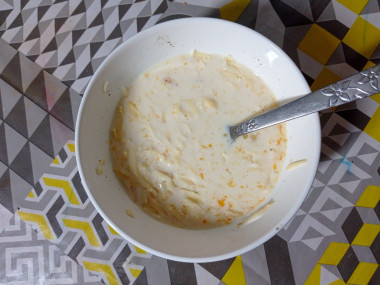 Приготовьте заливку. Вбейте в миску яйца, влейте молоко. Слегка взбейте их вилкой. Посолите и поперчите молочную смесь, перемешайте. Вы также можете добавить любые специи по вкусу. Сыр натрите на крупной терке. Высыпьте половину сыра в заливку, перемешайте.