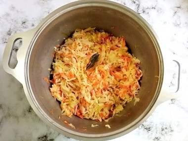 За пол часа капуста не особо поменяла цвет и не очень сильно уварилась. Если тушить дольше, то и объем овощей станет меньше и цвет будет более темный.