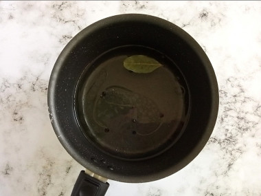 Приготовьте маринад для салата. В другую кастрюлю налейте чистую фильтрованную холодную воду, добавьте сахар, соль, растительное масло, лавровый лист и черный перец горошком. Поставьте кастрюлю на огонь, доведите до кипения и проварите маринад в течение пяти минут на среднем огне.