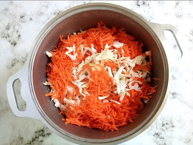Морковь помойте, очистите и нарежьте соломкой. Или натрите ее на крупной терке. А вообще проще всего капусту и морковь нашинковать кухонным комбайном, это ускорит процесс приготовления салата.