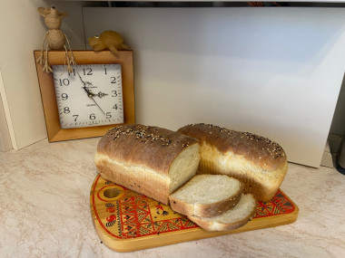 Тесто сделала по вашему рецепту, очень хорошее описание. Дрожжи использовала свежие в соотношении 3:1. Вместо 6 г сухих брала 18 г свежих дрожжей. Тесто получилось хорошее и упругое. Оставляла его на расстойку на 1 час в тепле. Форма у меня 23 на 13 см для выпечки хлеба. Уложив тесто в форму, смазала сывороткой по совету автора. Выпекала при 180 С 35 минут, запах стоял очень ароматный на всю квартиру.