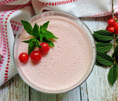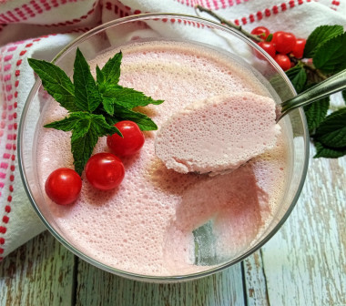 По рецепту нужно 300 г. ягод. Я насобирала 600 г. вишни, помыла её, довела до кипения и протерла через сито от косточек. Косточки у неё просто так не вынешь) Отмерила 300 г. пюре, оно как раз горячее было, поэтому сразу в нём и растворила желатин и сахар. Сливки у меня были 10%, я их не нагревала, просто соединила со сметаной и чуть тёплой вишневой массой. Перемешала венчиком и разлила по креманкам. Десерт получился ну очень нежный, пористый, воздушный! И он невероятно вкусный! Хотелось бы ещё и чернику попробовать, думаю, было бы еще вкуснее)
