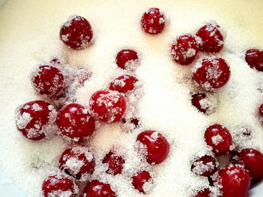 Ягоды пересыпьте в металлическую кастрюлю или чашку, не используйте алюминиевую посуду, чтобы избежать окисления. Засыпьте вишню сверху сахаром и оставьте на 6 часов, накройте сверху бумажным полотенцем. За это время вишня пустит сок, сахар растворится.
