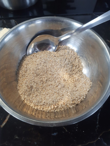 Хлопья измельчить в муку при помощи блендера или мясорубки. Добавить обжаренный и не мелко измельчённый арахис. Добавить кунжут обычный, обжаренные семечки.